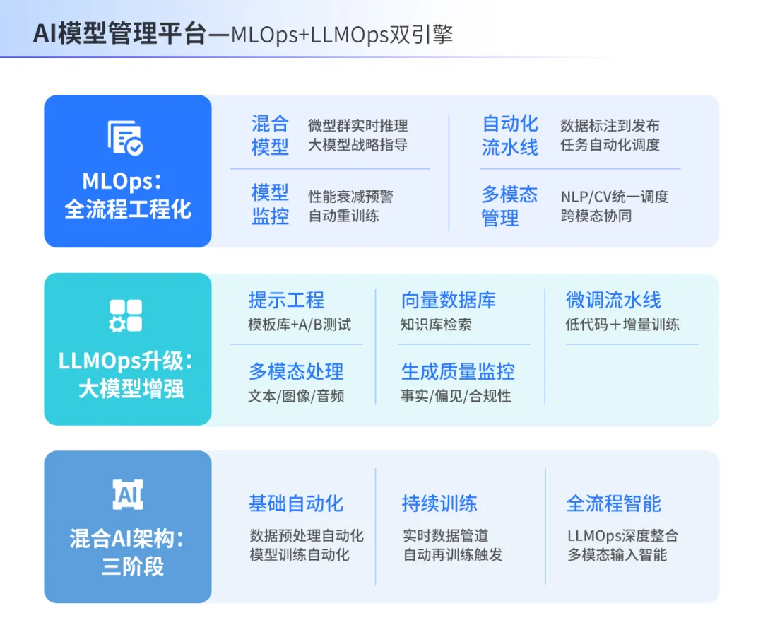 慧科訊業(yè)獨(dú)創(chuàng)的"微型模型群+大模型指導(dǎo)"混合式AI架構(gòu),內(nèi)置全流程MLOps體系確保模型持續(xù)進(jìn)化。MLOps體系實(shí)現(xiàn)了從數(shù)據(jù)到部署的全生命周期管理,對(duì)應(yīng)行業(yè)成熟度的三個(gè)階段。基礎(chǔ)自動(dòng)化階段,實(shí)現(xiàn)數(shù)據(jù)預(yù)處理、模型訓(xùn)練與評(píng)估的自動(dòng)化流程,解決人工操作效率低的問題。持續(xù)訓(xùn)練階段,建立實(shí)時(shí)數(shù)據(jù)管道,模型可根據(jù)新數(shù)據(jù)自動(dòng)觸發(fā)再訓(xùn)練。全流程智能化階段,結(jié)合LLMOps實(shí)現(xiàn)大模型特有的提示工程管理、向量數(shù)據(jù)庫(kù)集成和多模態(tài)輸入處理。