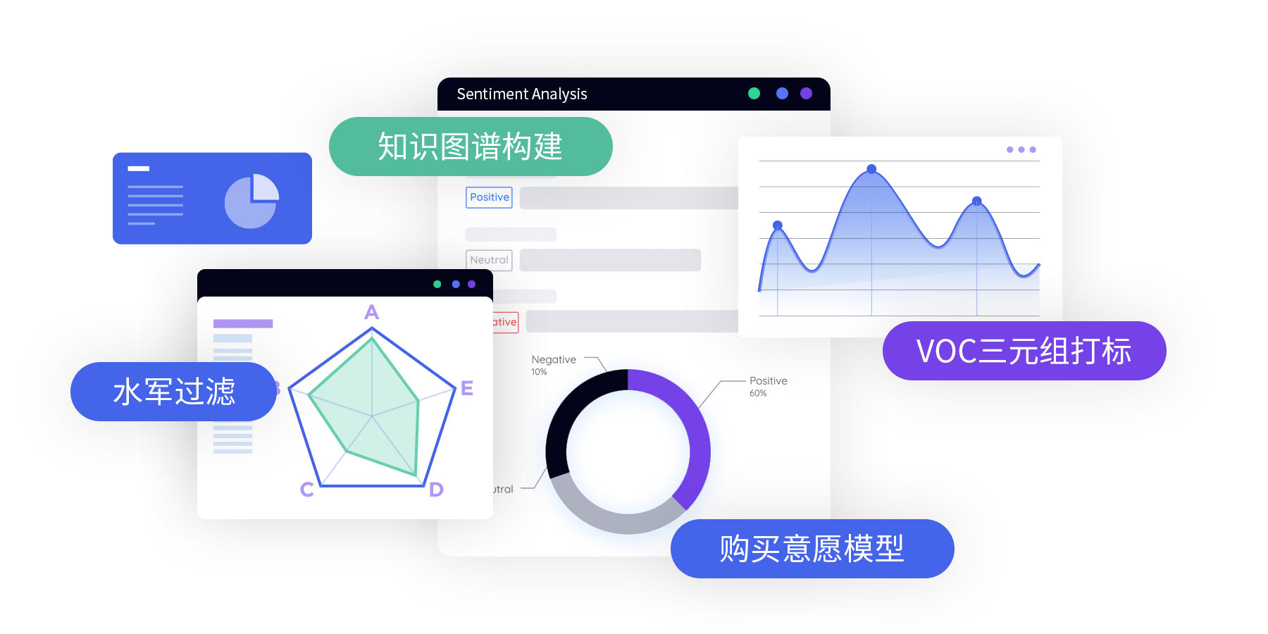 基于AI的多模態數據融合技術(PDF/視頻/語音/圖像識別),構建營銷全鏈路解決方案。通過水軍過濾、銷量預測、購買意愿模型等AI增強分析,實現從產品創新、品牌營銷全生命周期階段AI賦能。45個品牌模型訓練結合行業知識圖譜,精準識別真實聲量、挖掘消費動機,提供垂直行業的分析及研究解決方案,構建品效合一的增長加速器。